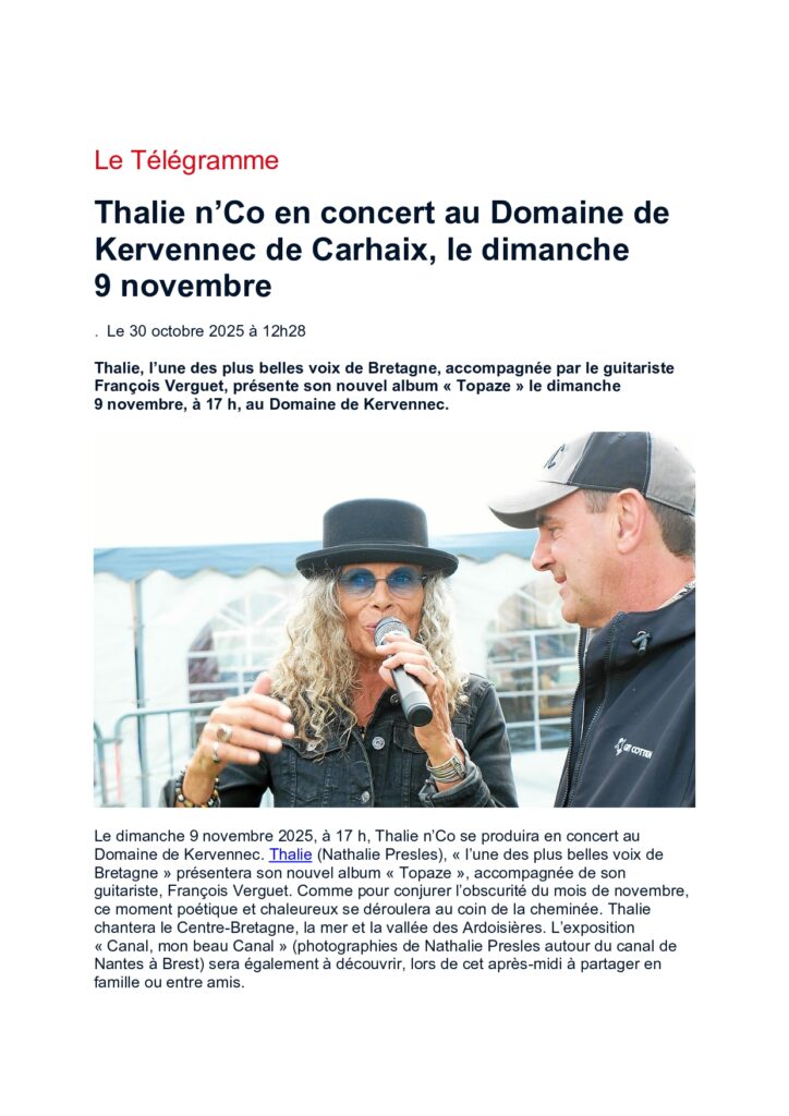 Et si elle a donné la réplique à Chabat, Lanoux ou Guy Marchand dans une vie antérieure, il peut paraître légitime de se poser la question de savoir qui porta l’autre? Car après avoir refermé la porte de ce monde où l’altruisme n’est l’apanage que des rares gentils dont elle aime s’entourer, Nathalie, Thalie sur scène, se consacre avec réussite depuis plus de vingt ans à la chanson. Installée dans la vallée des ardoisières à Maël-Carhaix, celle qui a imagine et organisé des festivals culturels et des grandes fêtes maritimes en centre Bretagne vient de sortir « Topaze», son premier album de compositions, entourée d’un équipage de musiciens aussi talentueux que soudés autour d’elle.